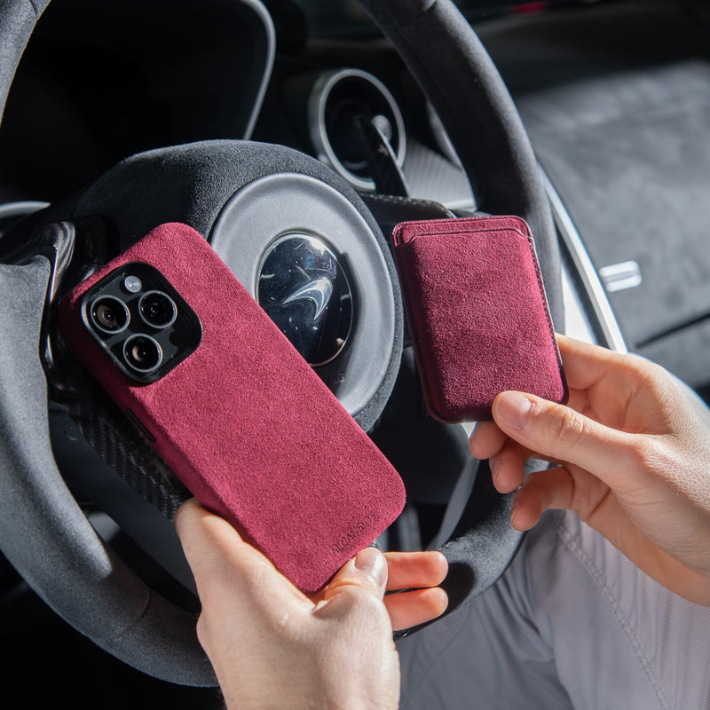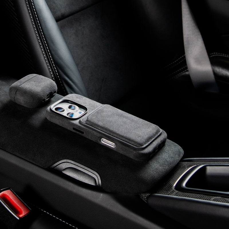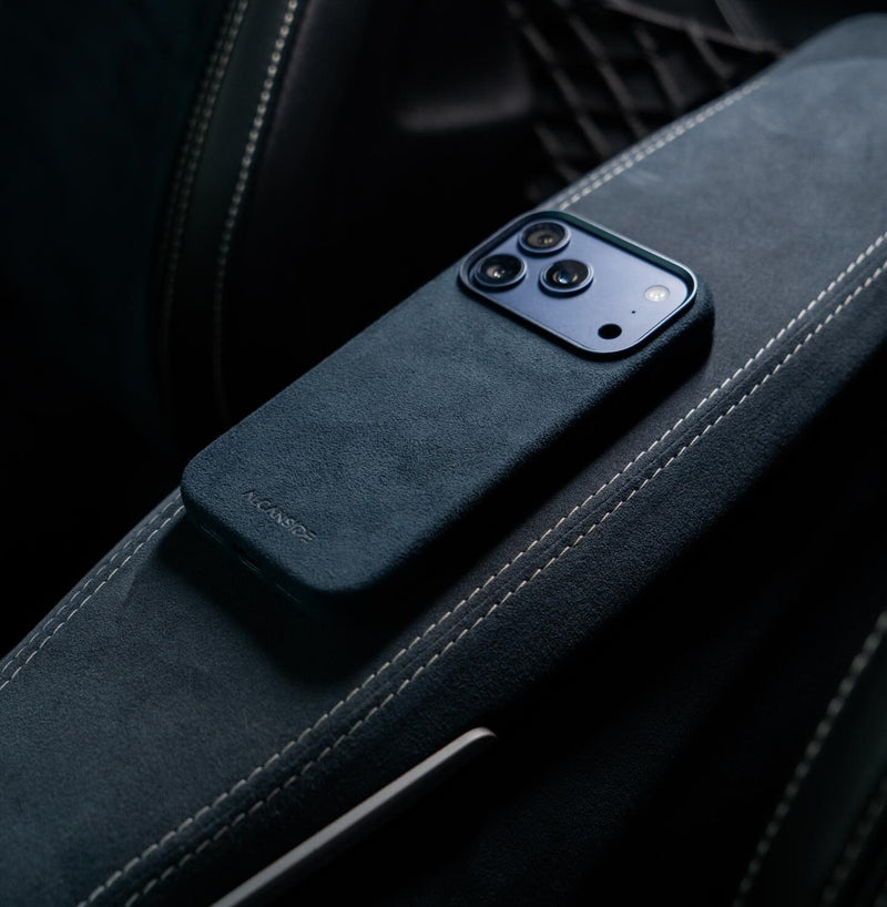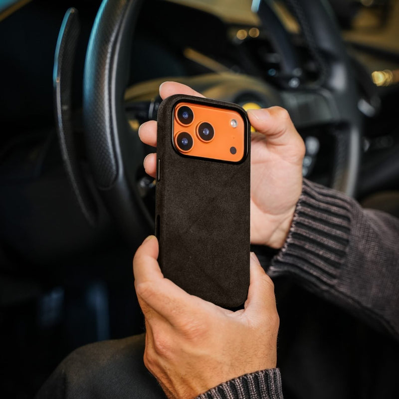 Phone Case – Alcantara Edition: A bold blend of protection and Italian craftsmanship. This case wraps your iPhone in official Alcantara® — the same material used in luxury cars — offering a soft, suede-like texture with a lightweight yet durable structure. Designed with a raised edge to guard your screen and camera, and metal button covers for a precise click, it delivers everyday function in a refined silhouette. Whether you're dressing your device for the office or the weekend, this case makes a statement without saying a word.